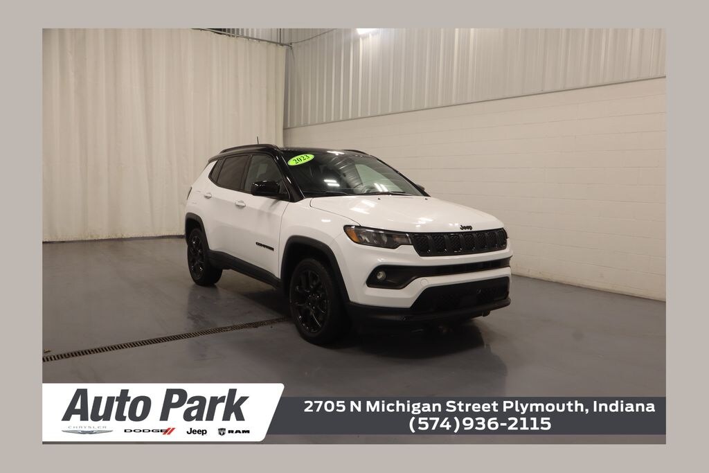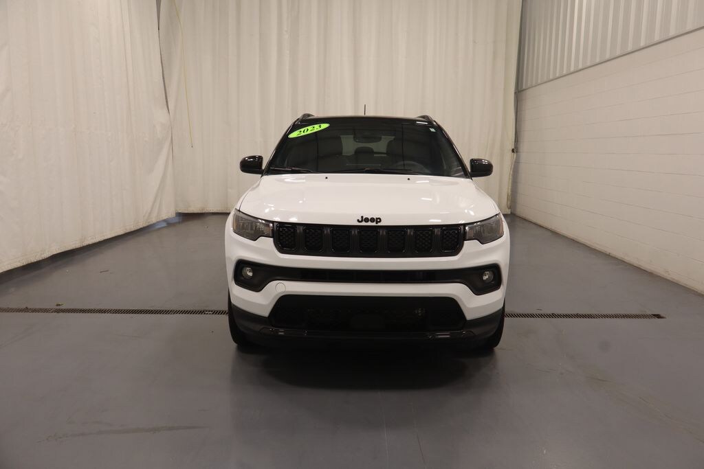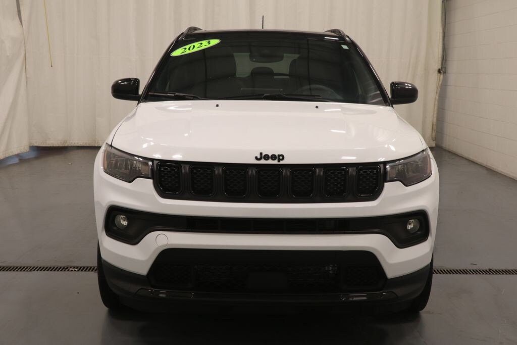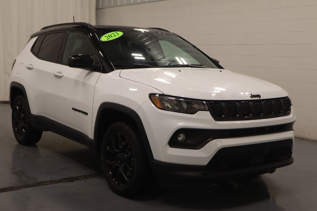 2023 Jeep Compass Bright White Clearcoat Altitude 4WD LOCAL TRADE, NON-SMOKER, ONE OWNER, Compass Altitude, 4WD, 2nd Row USB Type A/C Charge Only, Air Conditioning ATC w/Dual Zone Control, All-Season Floor Mats, Alloy wheels, Altitude Special Edition, Auto-Dimming Rear-View Mirror, Black Day Light Opening Moldings, Black Roof, Convenience Group, Electronic Stability Control, Foot Activated Open 'N Go Liftgate, Front fog lights, Fully automatic headlights, Gloss Black Badges, Gloss Black Grille & Crosshairs, Heated door mirrors, Heated Front Seats, Heated Steering Wheel, Humidity Sensor, Light Tungsten Interior Accent Stitching, ParkView Rear Back-Up Camera, Piano Black Interior Accents, Power 2-Way Driver Lumbar Adjust, Power Adjust 8-Way Driver Seat, Power door mirrors, Power Front/Fixed Rear Full Sunroof, Power Liftgate, Premium Alpine Speaker System, Quick Order Package 29B Altitude, Radio: Uconnect 5 w/10.1" Display, Remote keyless entry, Remote Start System, Reversible Carpet/Vinyl Cargo Mat, Steering wheel mounted audio controls, Sun and Sound Group, Universal Garage Door Opener, Wheels: 18" x 7" Gloss Black Painted Aluminum, Windshield Wiper De-Icer.